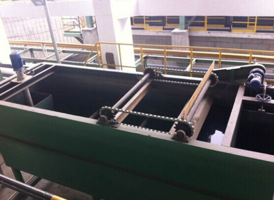 渦凹?xì)飧》Q為旋切氣浮,渦凹?xì)飧C(jī)是一種主要用于去除工業(yè)或城市污水中的油脂、膠狀物及固體懸浮物而設(shè)計(jì)的污水處理設(shè)備。系統(tǒng)主要由曝氣裝置、刮渣裝置和排渣裝置組成,其中曝氣裝置主要是渦凹曝氣機(jī),刮渣裝置主要由刮渣機(jī)和牽引鏈條組成,排渣裝置主要為螺旋推進(jìn)器,如下圖所示。工作時(shí),溶氣設(shè)備由電機(jī)帶動(dòng)高速旋轉(zhuǎn)(旋